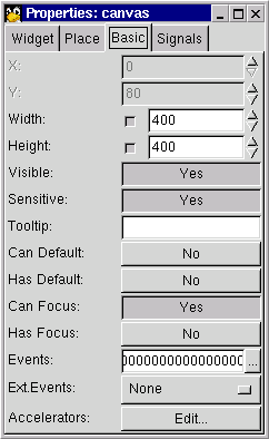 Bundan sonra Gnome uygulama aletinin asıl alanına bir kanvas ekleyin. properties(özellikler) diyaloğundan maksimal koordinatları 400'e, maksimal yükseklik ve genişliği de 400'e ayarlayın.